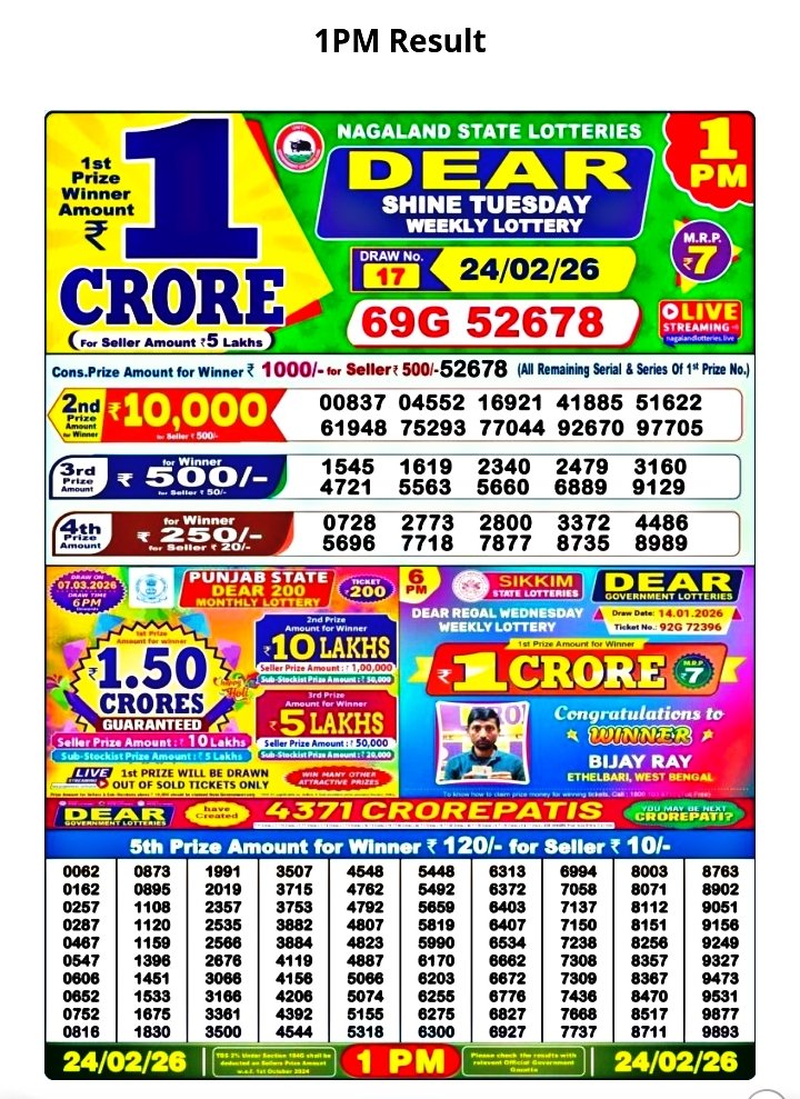 Nagaland Dear Lottery 1 PM Winner’s List/Number’s: